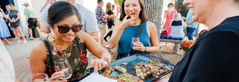 Gourmet, seasonal pizzas cut into tasting bites to pair with five wines.